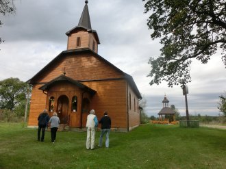 Die ehemals prachtvolle römisch-katholische Holzkirche konnte dank der Initiative einer Polin von der TU Danzig - und mit EU Fördermitteln - wieder zur Zierde des Dorfes werden, nachdem sie zuvor jahrelang einen solch traurigen Anblick geboten hatte.