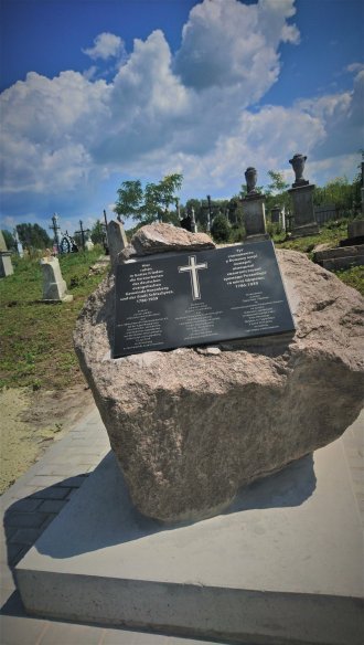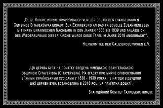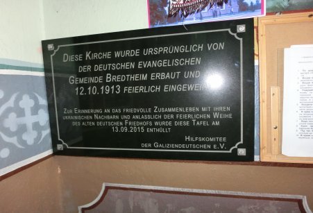 "Diese Kirche wurde ursprünglich von der deutschen ev. Gemeinde Bredtheim erbaut und am 12.10.1913 feierlich eingeweiht. Zur Erinnerung an das friedvolle Zusammenleben mit ihren ukrainischen Nachbarn und anläßlich der feierlichen Weihe des alten deutschen Friedhofs wurde diese Tafel am 13.09.2015 enthüllt. Hilfskomitee der Galiziendeutschen e.V." - Gleich daneben wurde dieselbe Steintafel mit dem ukrainischen Text angebracht.