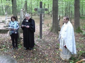 Der griechisch-katholische Ukrainer, Pfarrer Wasyl aus Sedlyshche/ Kolomea und der evangelisch-lutherische Deutsche, Pfarrer Friedhelm Hans aus Landau/ Pfalz, weihen den restaurierten deutsch-evangelischen Friedhof im früheren Bredtheim /Sedlyshche.